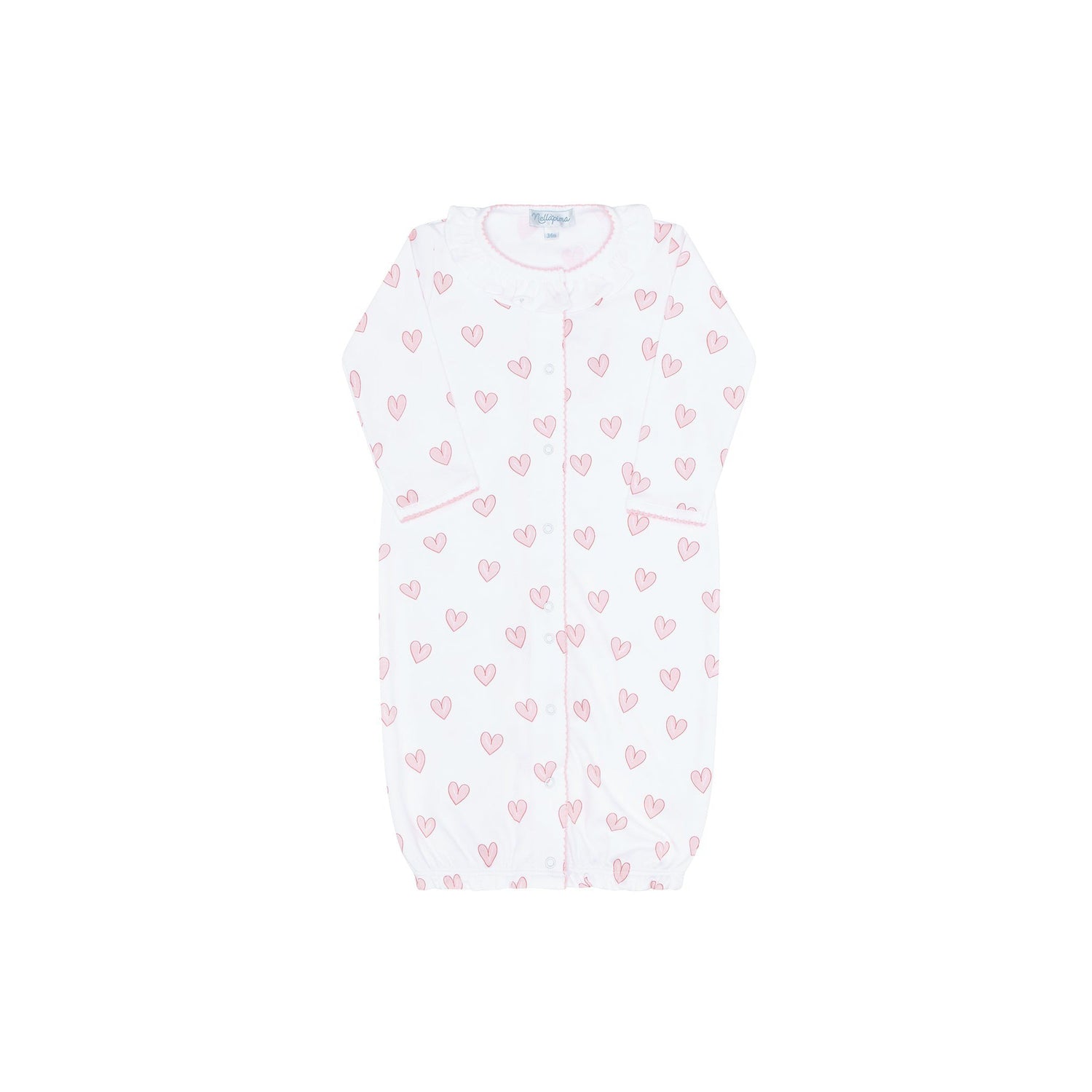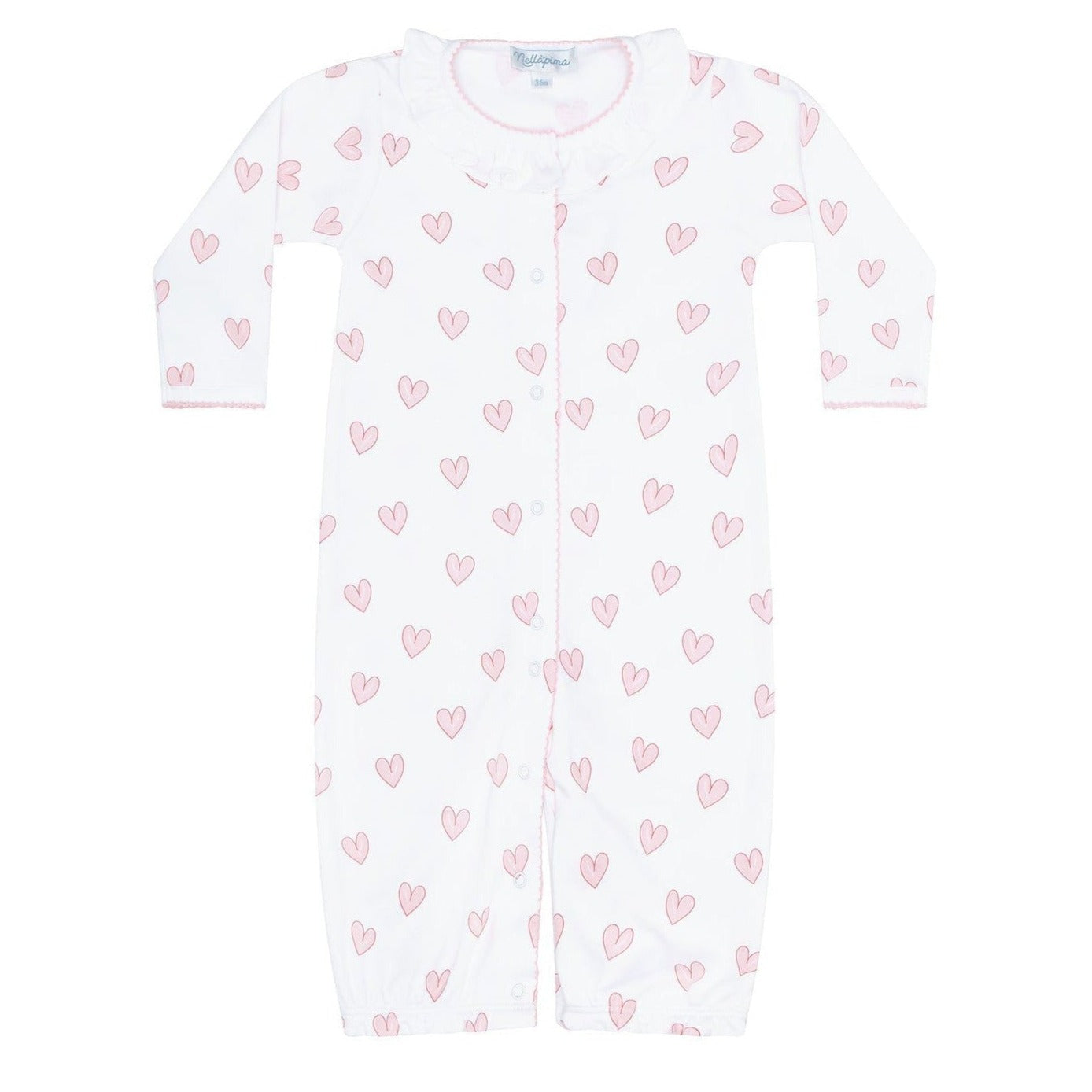Our Pink Heart Print Converter Gown features a picot trim detail around the collar, cuff and down the snap-close front in a classic pastel pink color, and is printed all over with heart shaped designs. Made of 100% Pima cotton, this gown is stretchy and feels soft on your baby's skin.