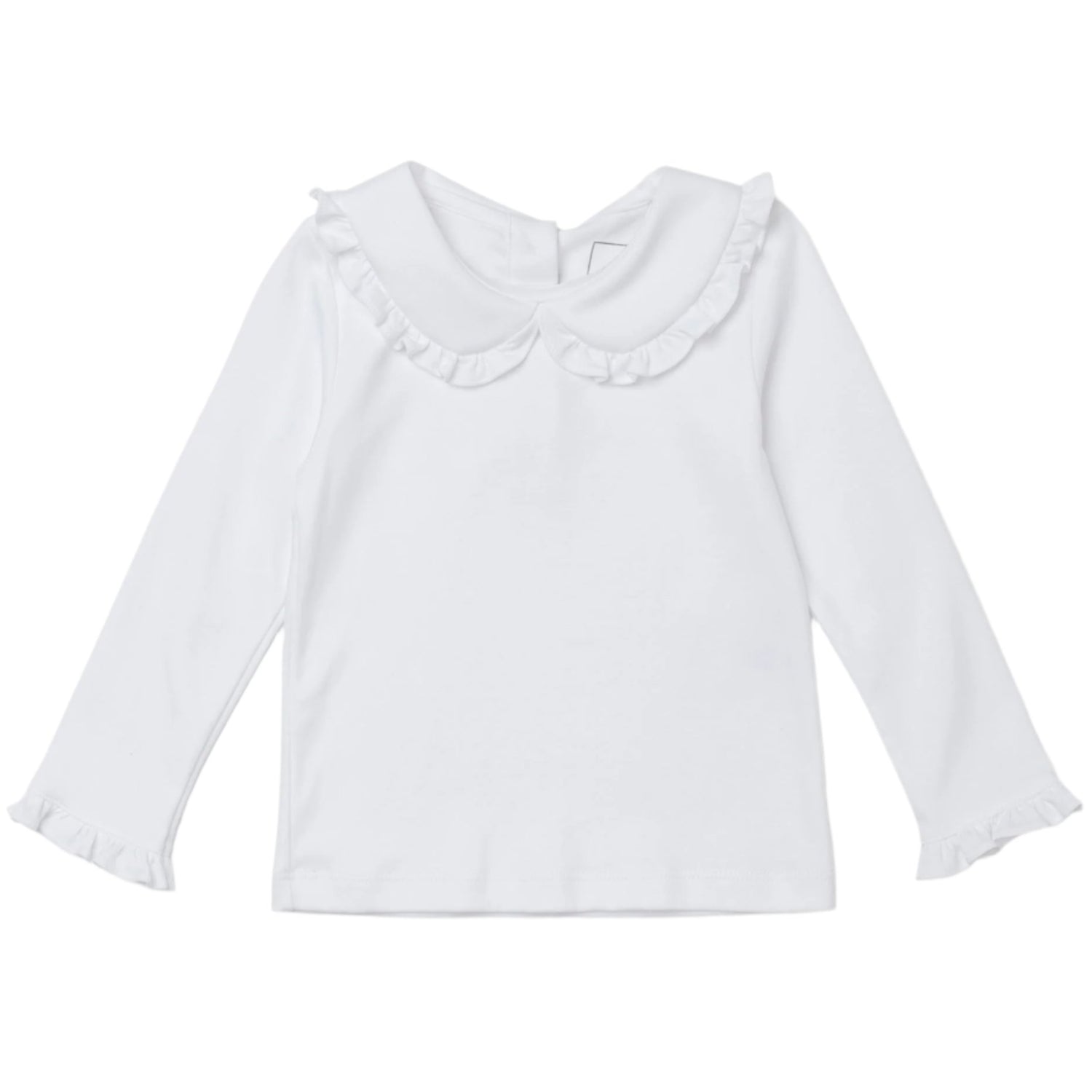 Girls' pima cotton long sleeve shirt with ruffled peter pan collar. Button closure along the back.