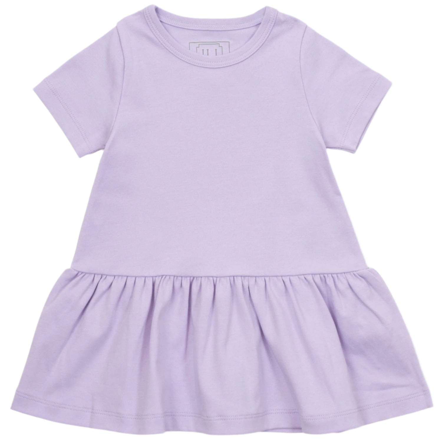 Girls' short sleeve t-shirt dress with dropped waist and flutter skirt.