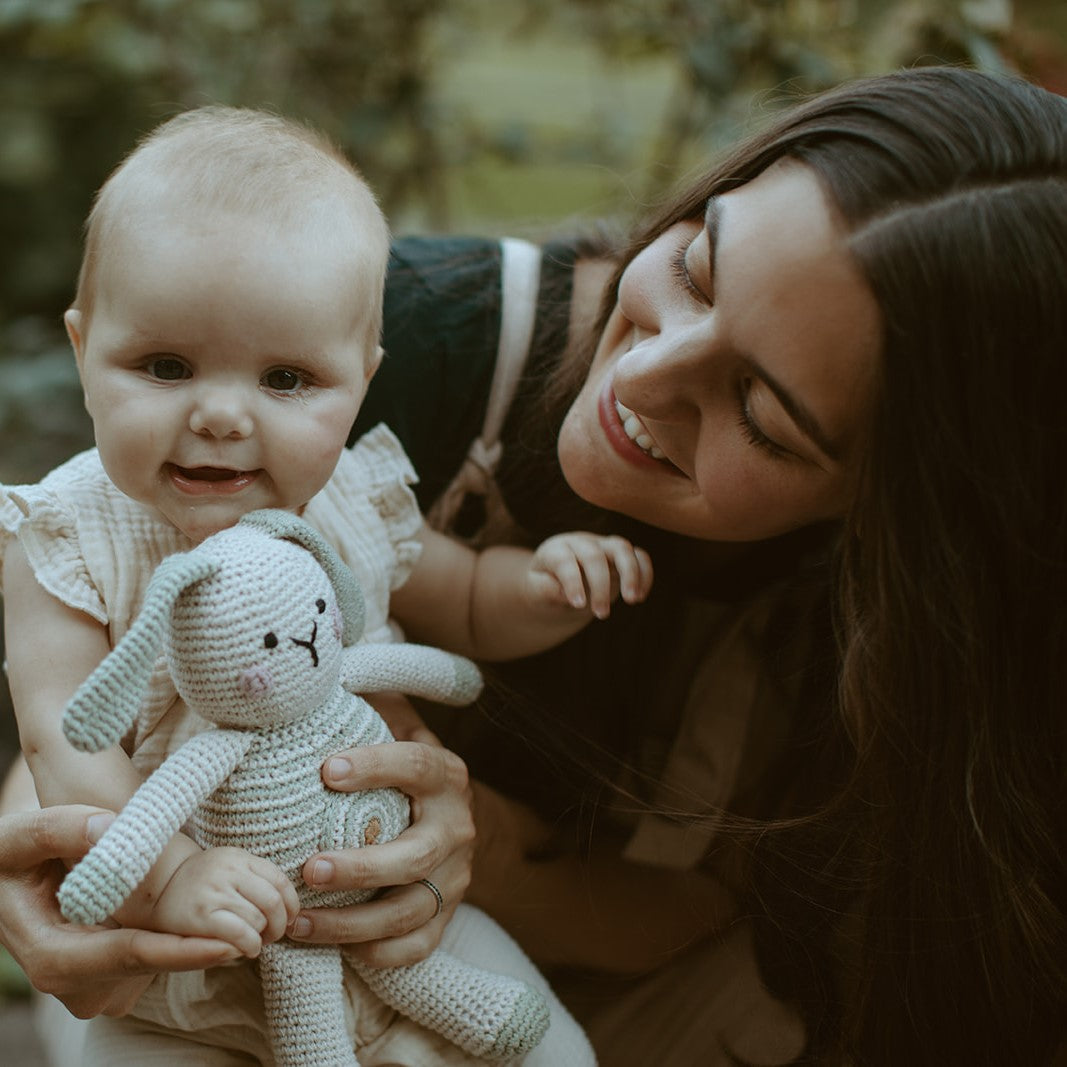 He can jump and bounce, cuddle and snuggle. Both bright and soft, our stuffed bunny is the perfect companion for your little adventurer. Handmade with soft cotton yarn, this knit toy is easy for little hands to hold. The rattle inside gives a small jingle when shaken. Perfect for hours of imaginative play.