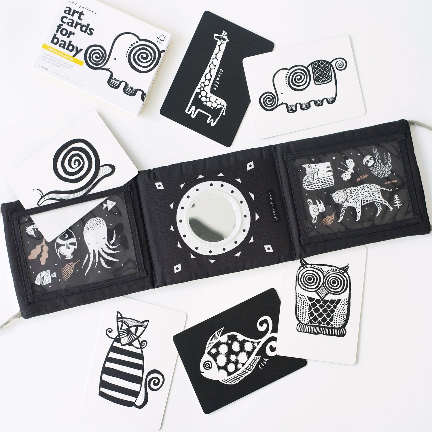 This tummy time toy was created especially to help babies from newborn up to the first year engage and develop a wide range of senses and motor skills. With the allure of a soft book, plus textured embroidery and pockets where the images can be switched out with various Art Cards. The gallery can be laid flat with a light or dark black and white side, or it can be tied together for form a 3D triangle, so that baby can enjoy tummytime play on their own and can look at it while laying down, pushing up, or in a seated position.