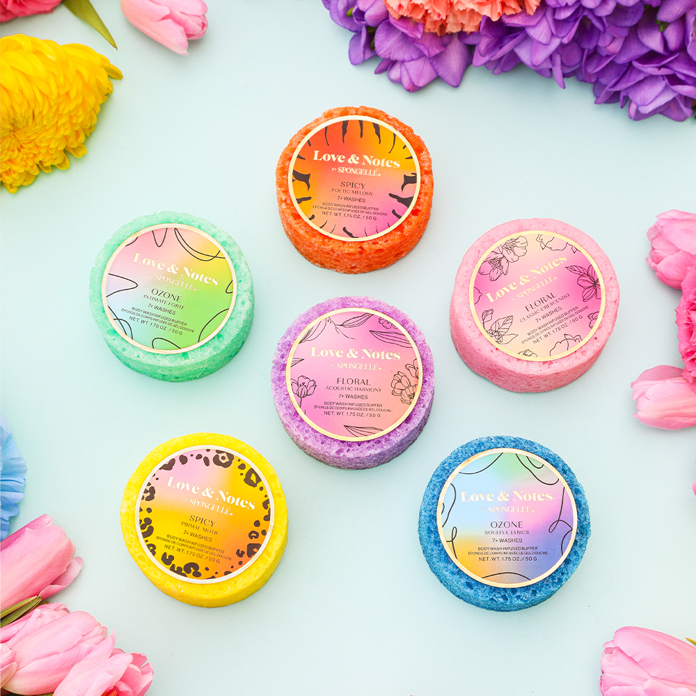 The Love & Notes Spongette Assorted Pack is equal parts bath sponge and body buffer in a compact, travel-friendly size. Accepted on all airlines, nothing to spill, nothing to break, and everything you need for soft and youthful skin.  The assorted pack includes all six body buffers with a mix of floral, ozone, and spicy notes. Embark on a harmonious experience of relaxation, exfoliation, and reinvigoration with each fragrance starting you off on a melodic journey.