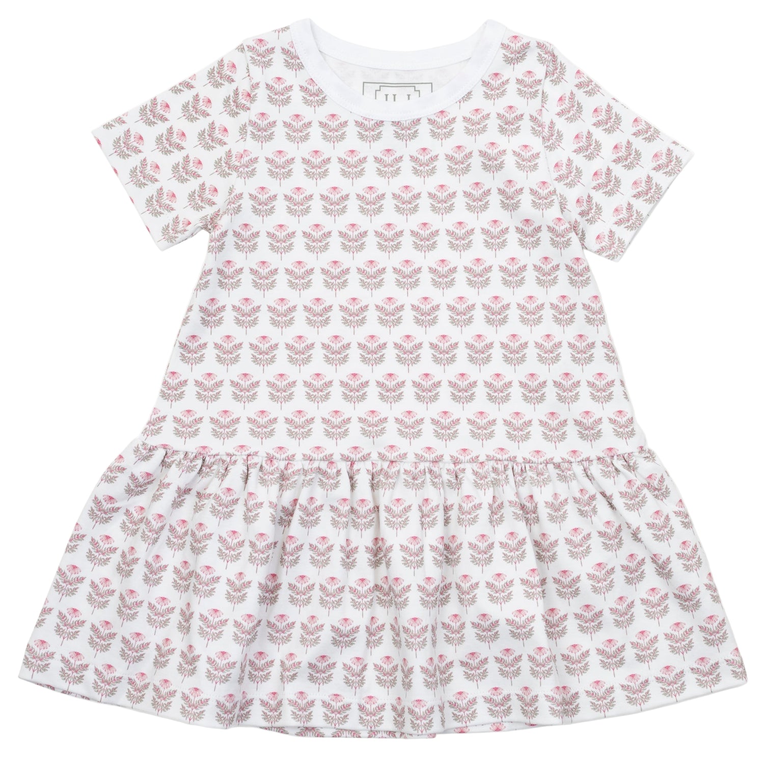 Girls' short sleeve t-shirt dress with dropped waist and flutter skirt. Made from 100% Peruvian Cotton.
