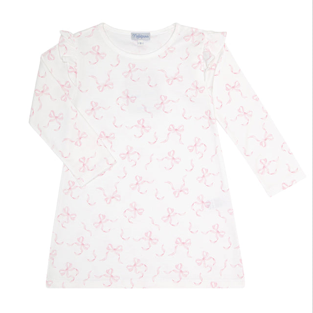 A playful yet refined piece, this dress is perfect for daytime outings, family gatherings, or casual playdates. Made from ultra-soft Pima cotton, it features fluttery sleeves, a comfortable fit, and our signature pink bow print. Style it with a matching hat or blanket for a complete look.