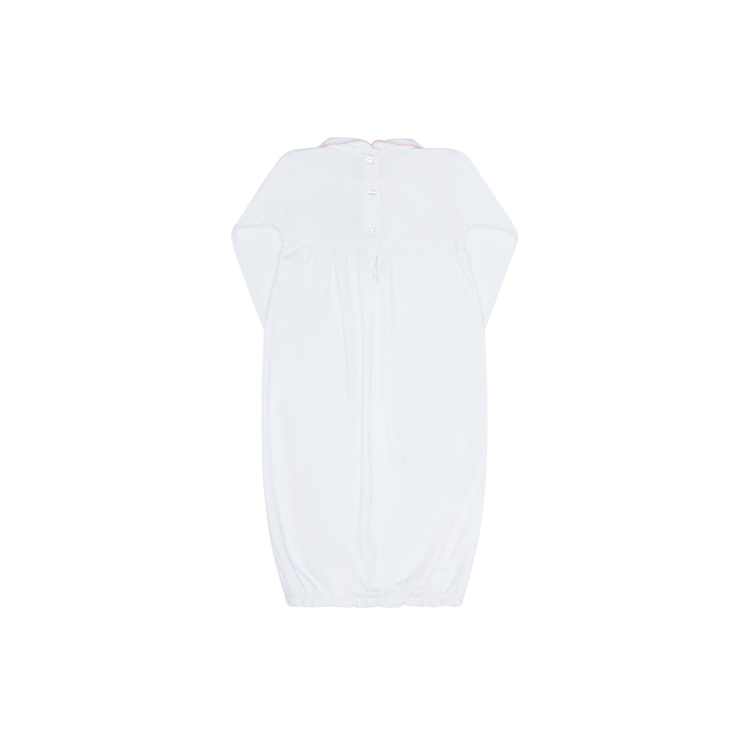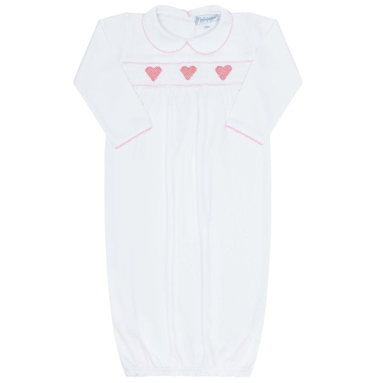 Our gown is designed for easy diaper changes. It features an open bottom that allows for quick access when it's time to change your baby's diaper. No more struggling with buttons or snaps in the middle of the night. Our 100% Pima Cotton Heart Smock Gown comes in a pristine white color adorned with pink hearts on the smock, creating an enchanting and delightful look. Available in sizes ranging from 0 to 12 months, this gown is crafted with love and care to ensure utmost comfort and irresistible style.