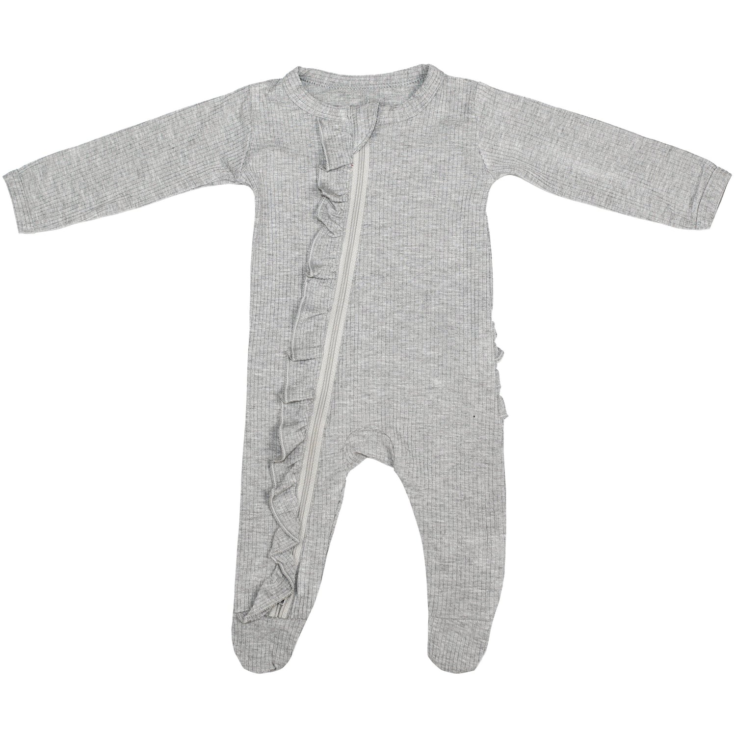 Ruffle 2 Way Zip Romper - Ribbed Gray - Newborn is backordered and will ship as soon as it is back in stock.