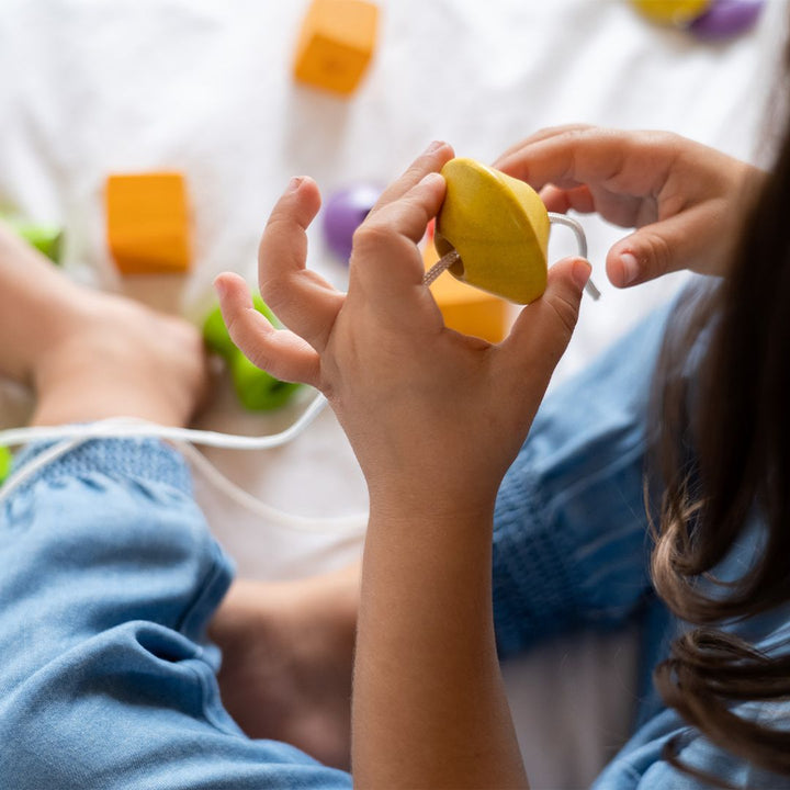 Children can learn about colors, shapes, and sizes while developing motor skills. One set includes 2 laces and 30 wooden beads in 6 different shapes and colors.