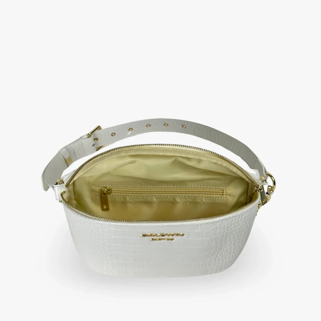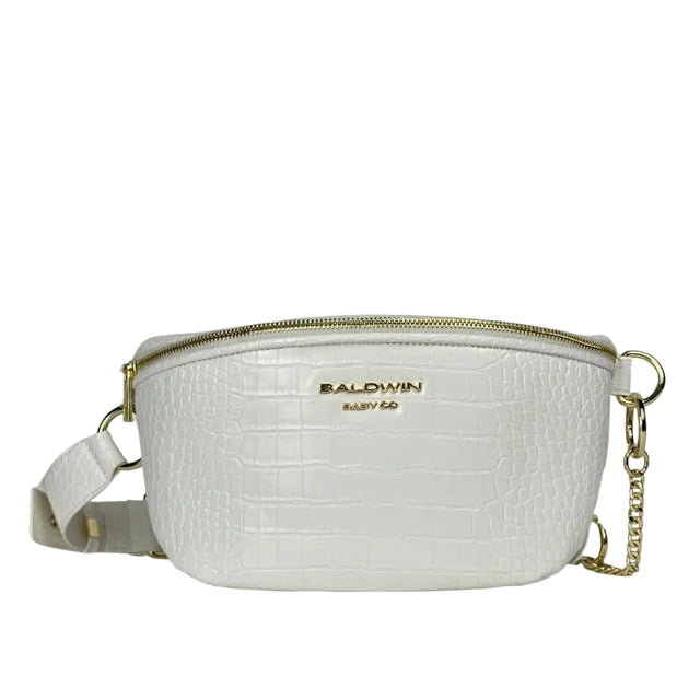 The Ono Cross Body Belt Bag in pearly white is where style meets practicality, designed for moms who need both hands free while staying effortlessly chic. Crafted from premium vegan leather with a striking crocodile texture, this bag offers a perfect blend of fashion and function. Whether you’re running errands, out for a quick stroll, or need a compact option for your essentials, the Ono delivers style in every situation.