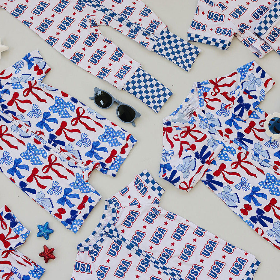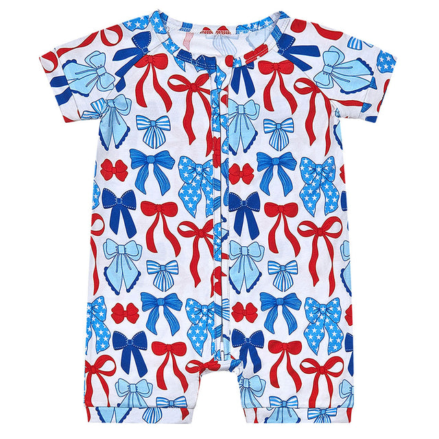 Add a pop of patriotic sweetness to your little one's summer wardrobe with the Bamboo Shorty Romper Red-White & Bows!