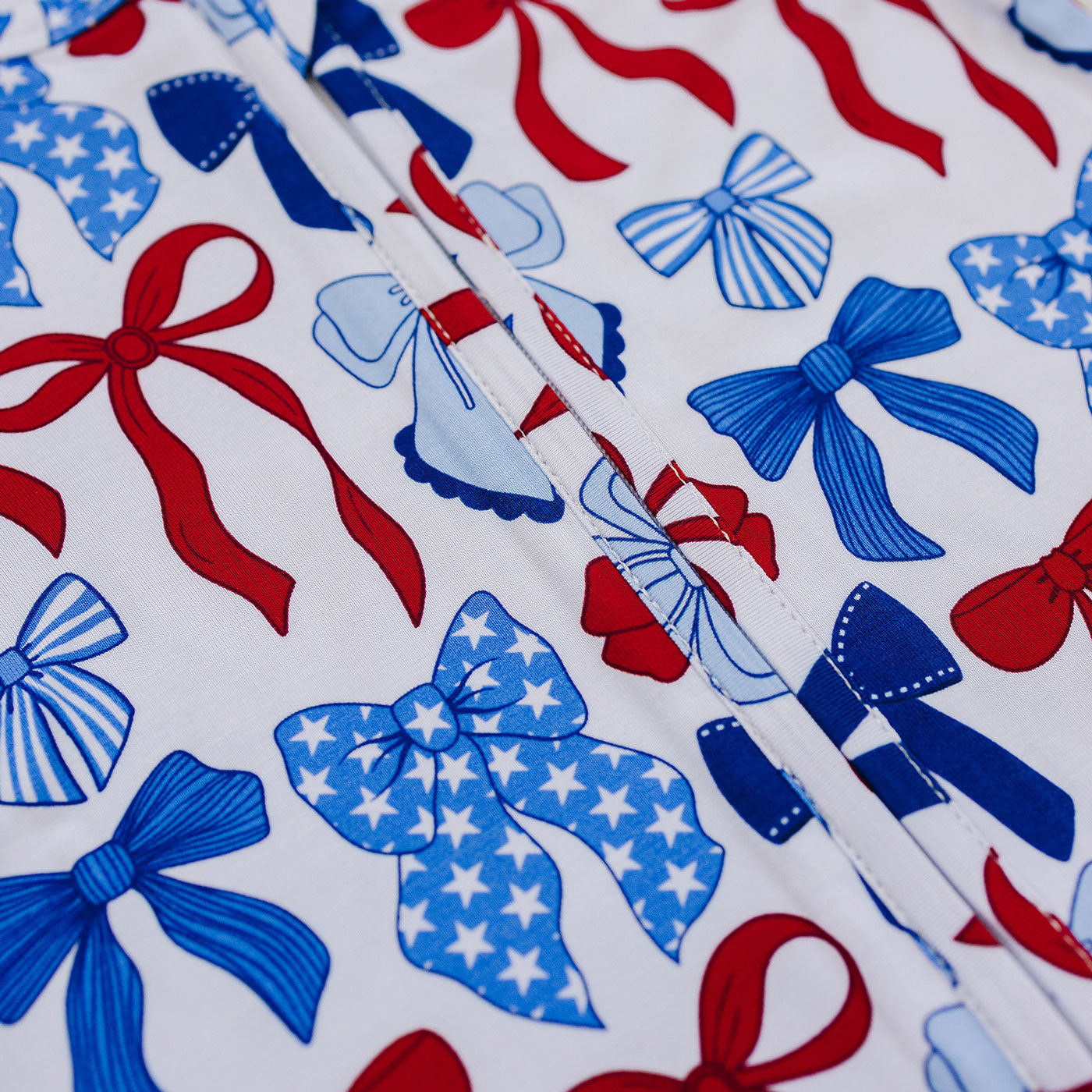This adorable romper features a charming print of red, white, and blue bows, making it the perfect outfit for all your patriotic celebrations. Crafted from buttery-soft bamboo, it's lightweight, breathable, and stretchy—keeping your little one comfy whether they're playing, exploring, or napping on a warm day.