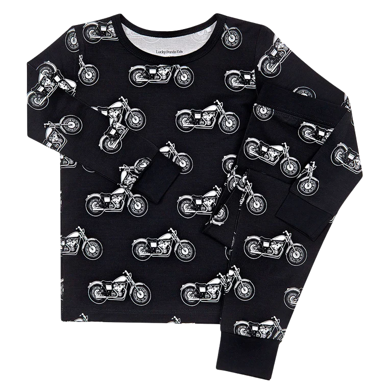 Gear up for endless fun with the Bamboo Two Piece Set | Born to Ride Black. Featuring all over motorcycle prints, this set adds a dose of adventure to everyday wear. Made from stretchy, breathable bamboo fabric, it moves with your little one for all day comfort whether they are racing through playtime or winding down for bedtime.