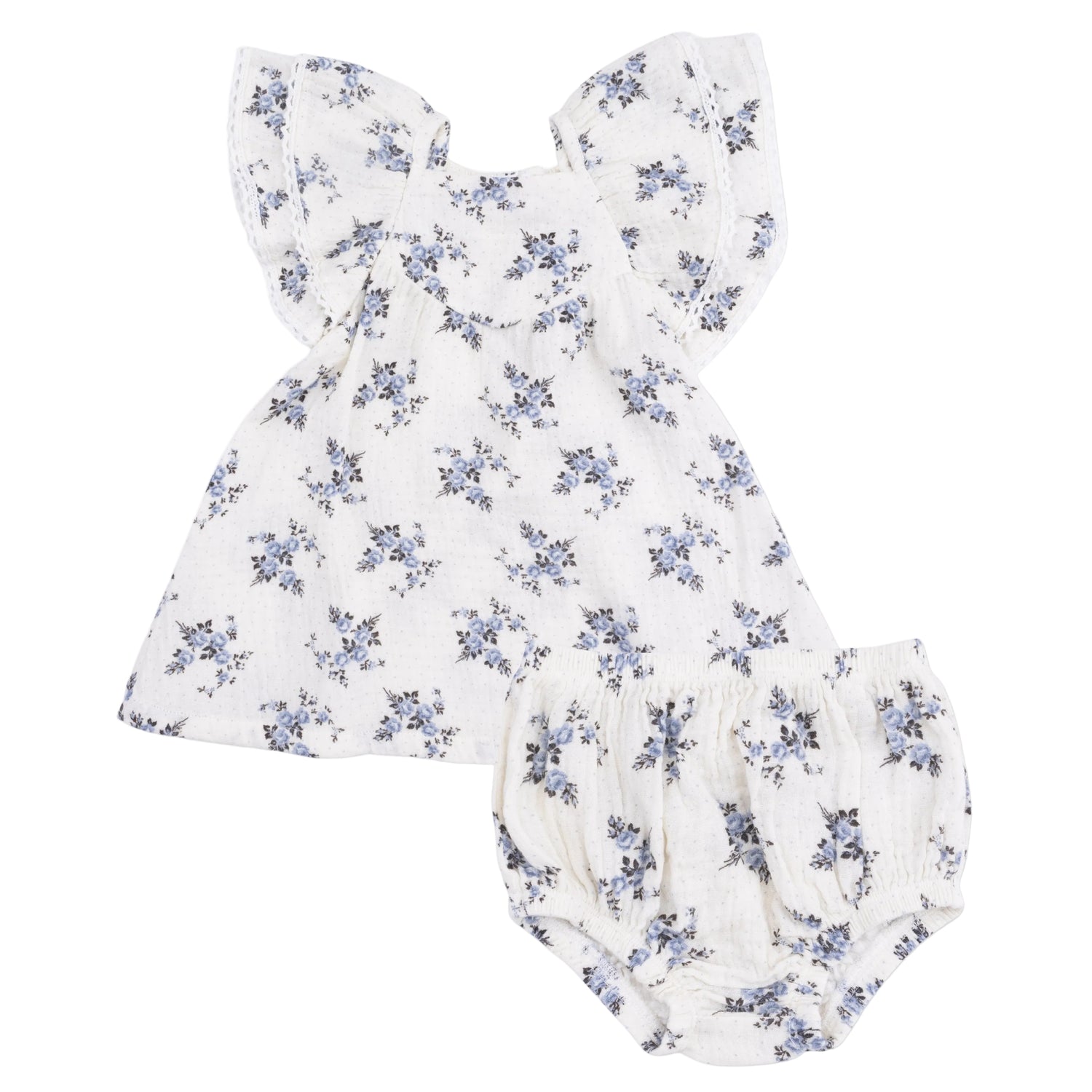 Our V-Neck Dress and Bloomer, made from silky-soft Organic Cotton Muslin, brings comfort and charm together in one perfect set. Featuring big ruffle sleeves with delicate crochet trim, elastic at the neck and legs for a cozy fit, and a snap closure on the back for easy dressing, this outfit is perfect for playdates, photos, or everyday adventures.
