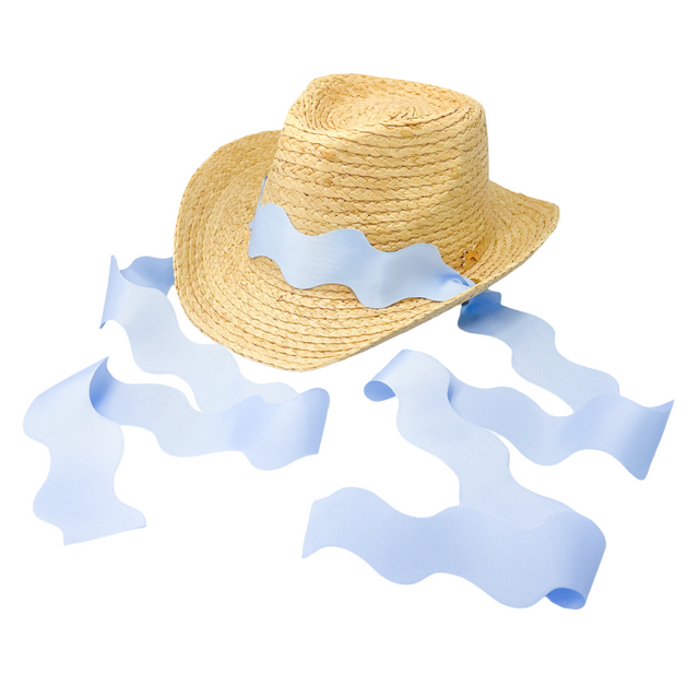 This stylish straw cowboy hat will have you ready for the rodeo. Each is integrated with a wavy blue scalloped ribbon to add a bit of whimsy to your outdoor adventures — from the stables to the pasture to the riding ring, and everywhere in between.
