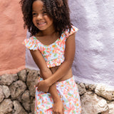 Ruffles galore for your Princess of the Seashore! Our Hawaiian Luau-inspired girls bikini is made of sustainable and breathable UPF50+ fabric in a floral pattern and doesn't skimp on the frills. Tug on the two-piece and channel her inner Moana, setting off in search of shells and sea creatures.