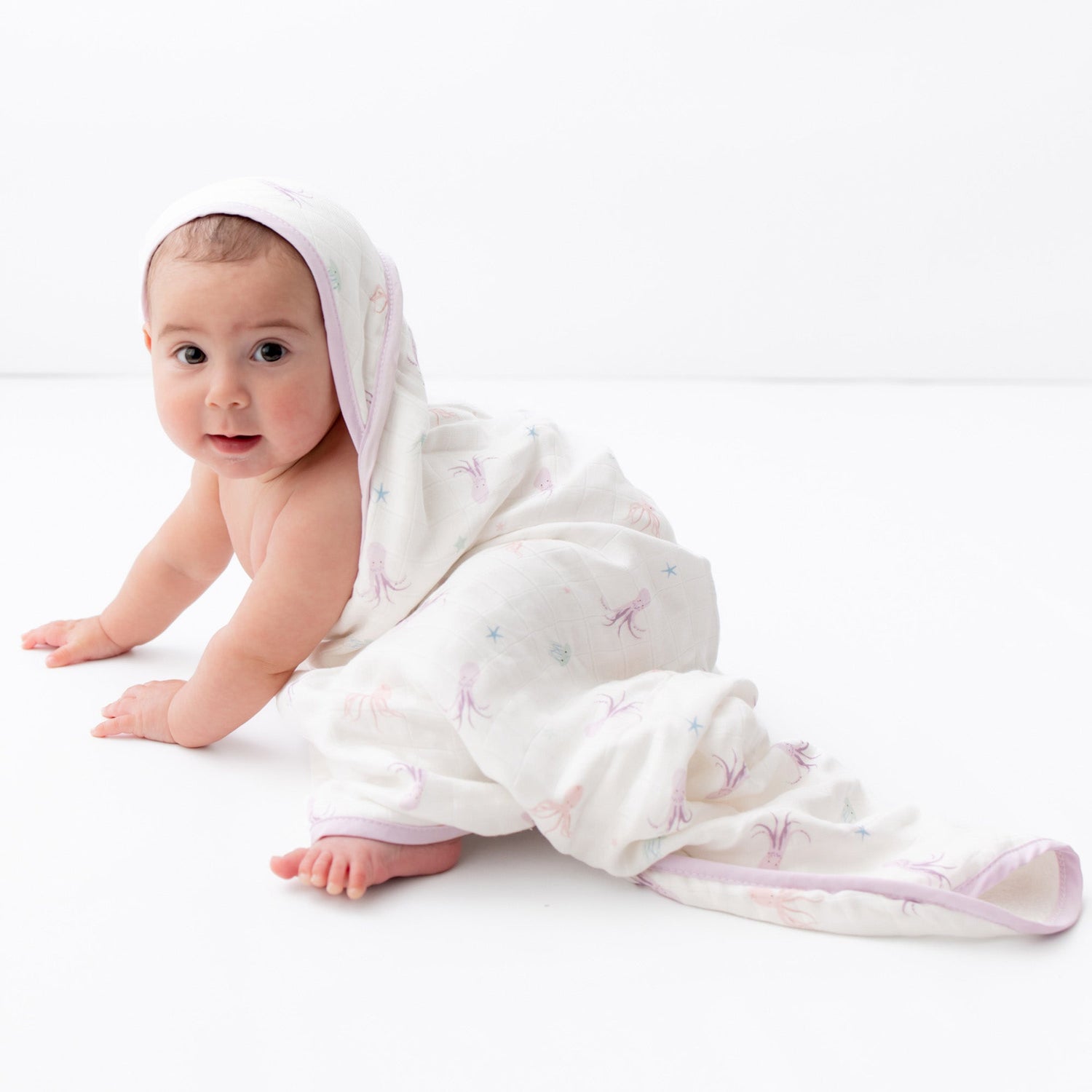 Bamboo Little's matching hooded towel and washcloth sets make bath time a joy. Each towel and washcloth features an ultra-absorbent and super-soft terry backing. The generously sized towels are perfect for babies with sensitive skin, offering natural moisture-wicking and odor-resistant properties, ensuring smiles long after the splashes are over.