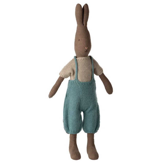A classic rabbit made of soft natural fabrics that gives a lovely hand feel and look. He is dressed in a knitted shirt with beautiful knitted overalls on top. Check out our clothes and furniture collection to expand the rabbit's accessories.