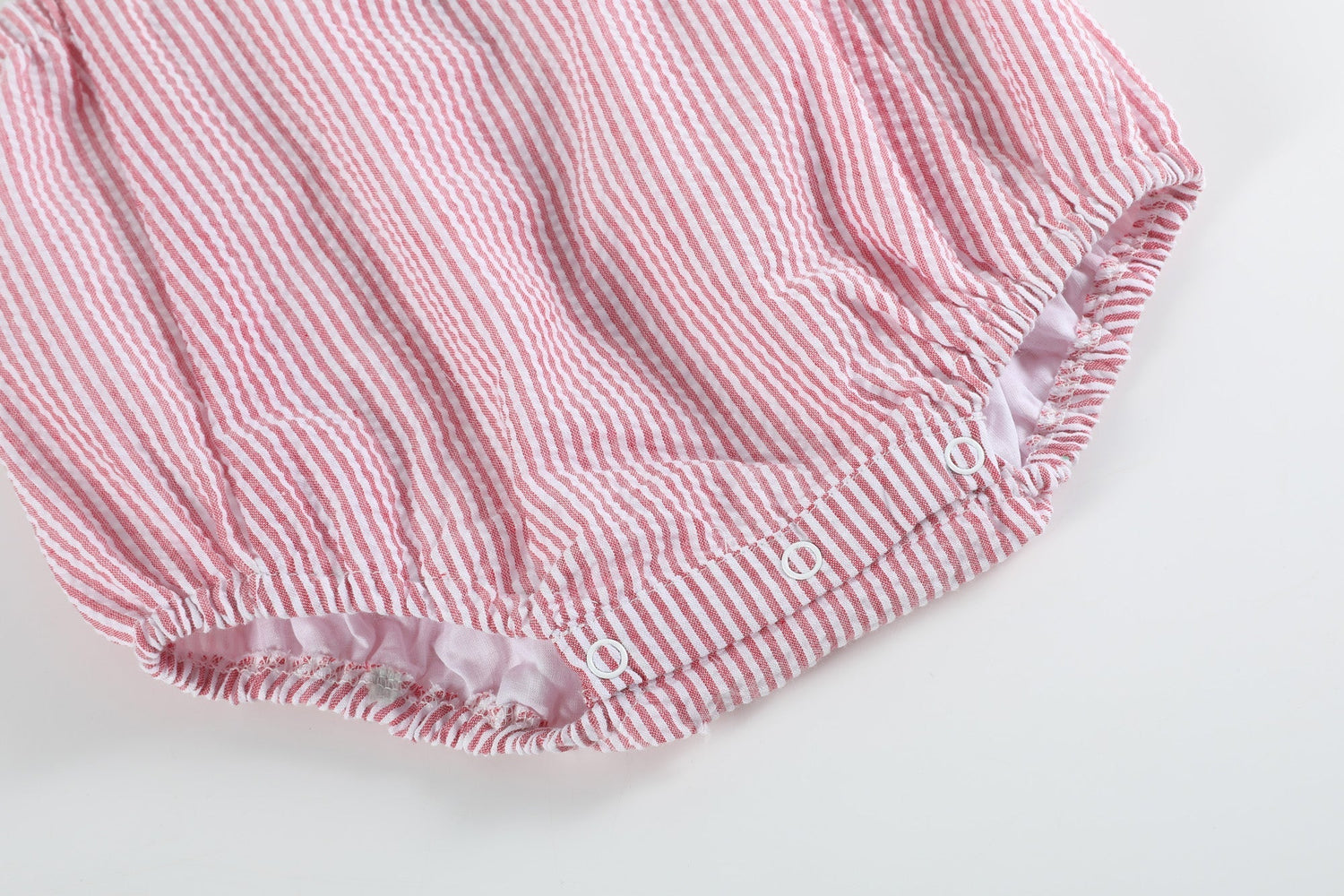 This Red Seersucker Strawberry Ruffle Romper is a sweet little treat for your little sweetie. Detailed with flutter sleeves, bow on the back and intricate strawberry appliqué will make your baby stand out in style! Vibrant buttons at the shoulder allow for size adjustments and snaps on the crotch for easy diaper changes.