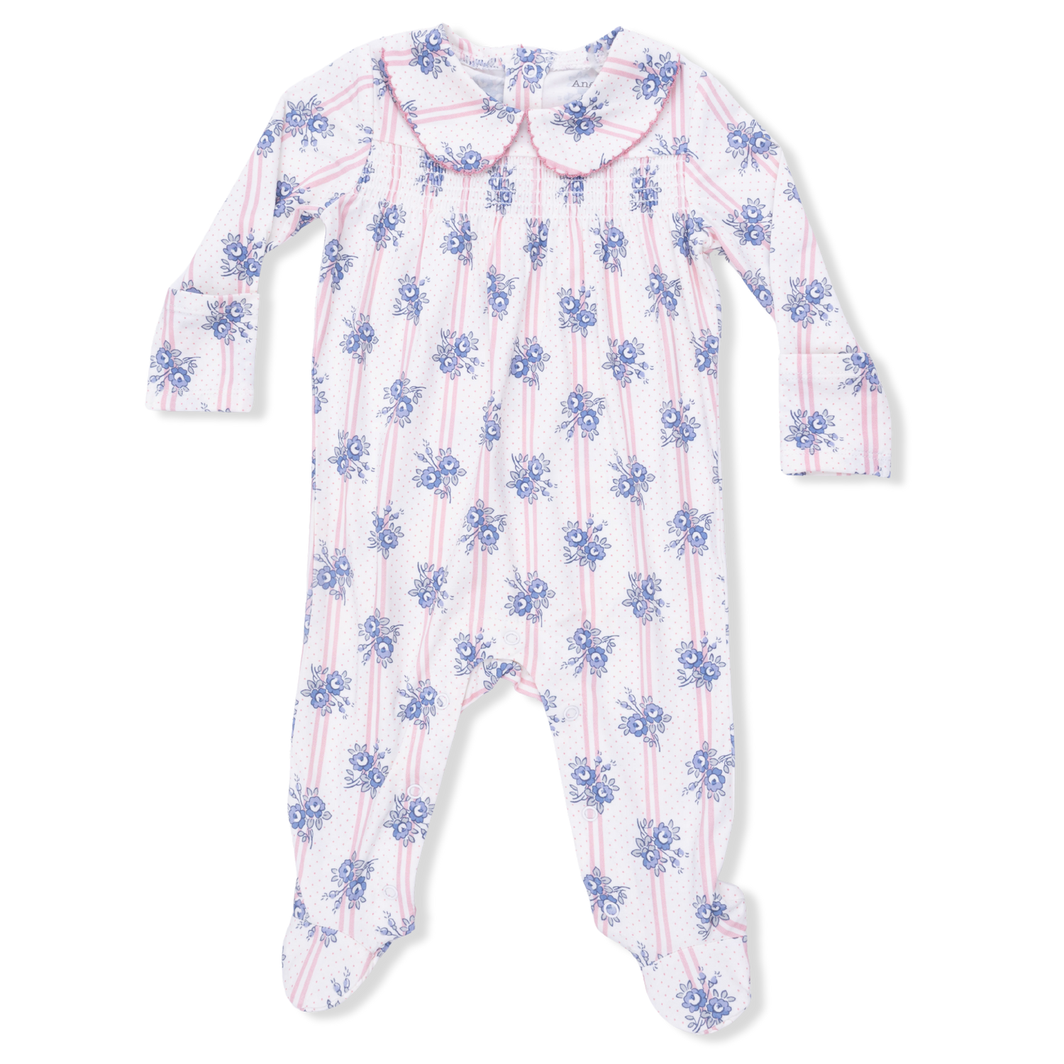 Stripe Dot Roses - Smocked Peter Pan Snap Footie - NB is backordered and will ship as soon as it is back in stock.