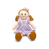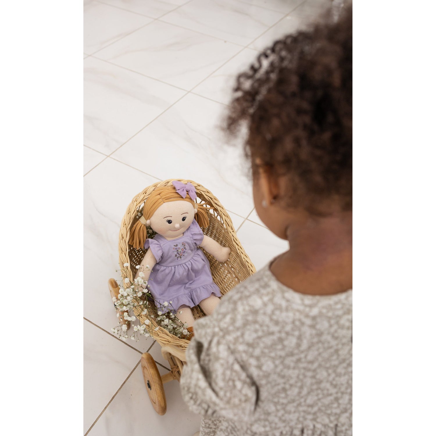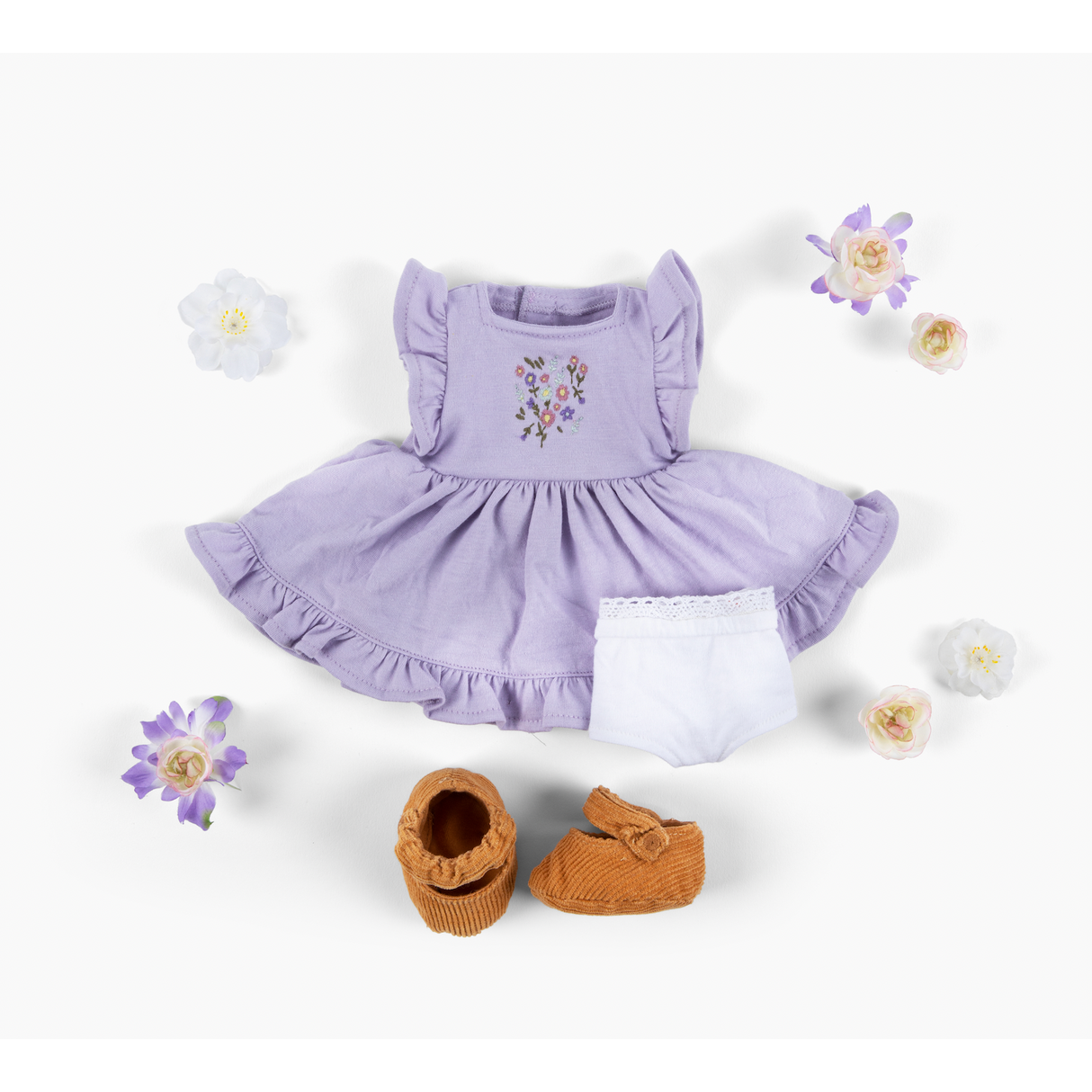 Amelia comes dressed in a lavender cotton dress with floral embroidery, white underwear, and adorable corduroy mary jane shoes.