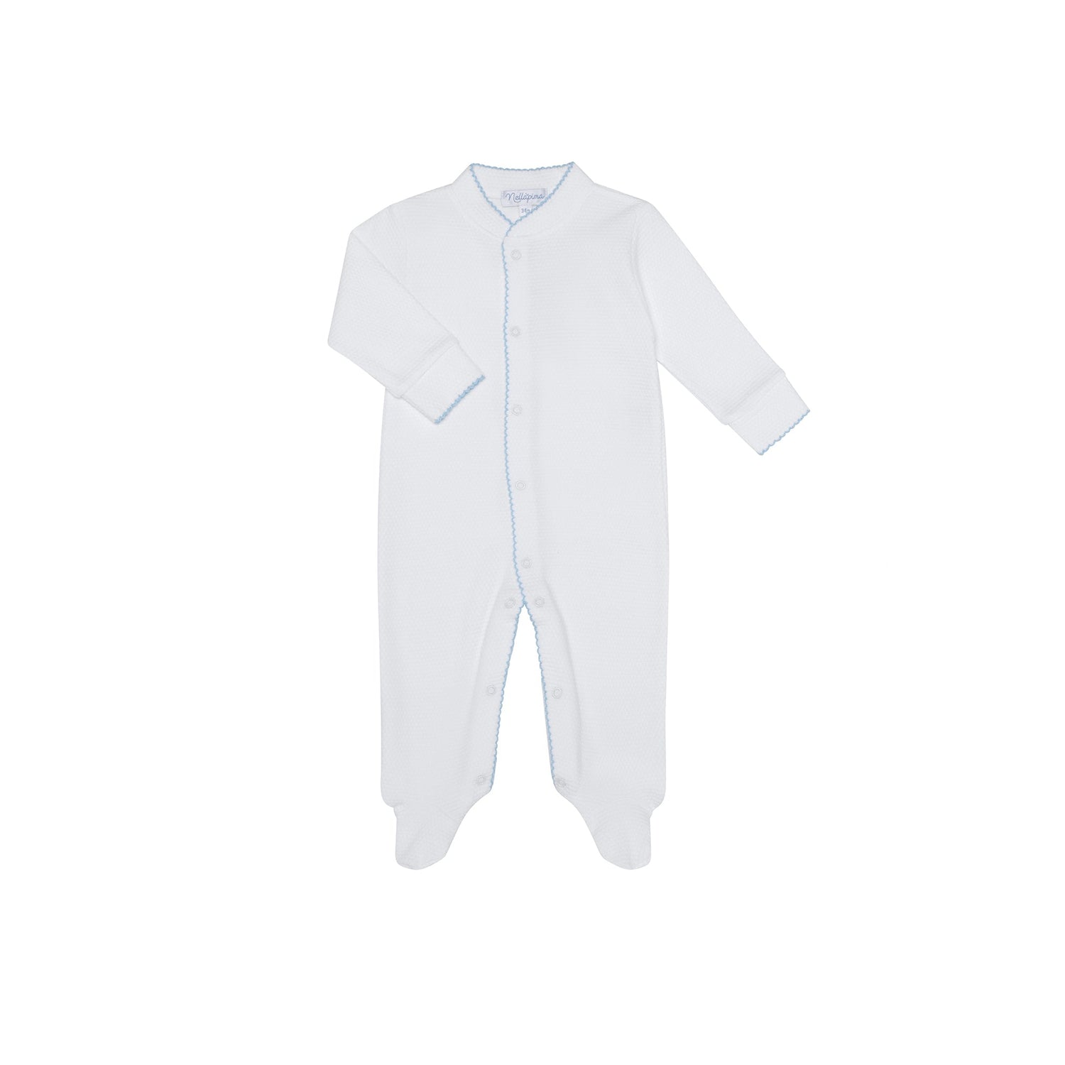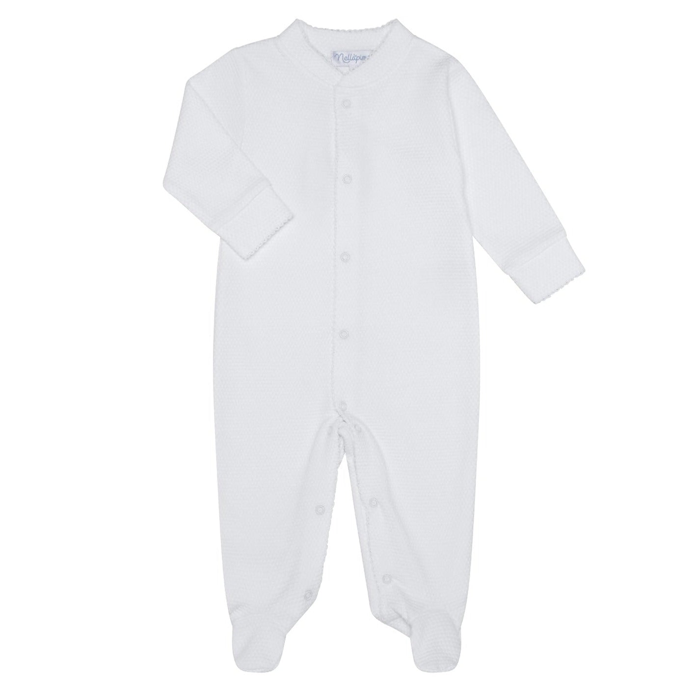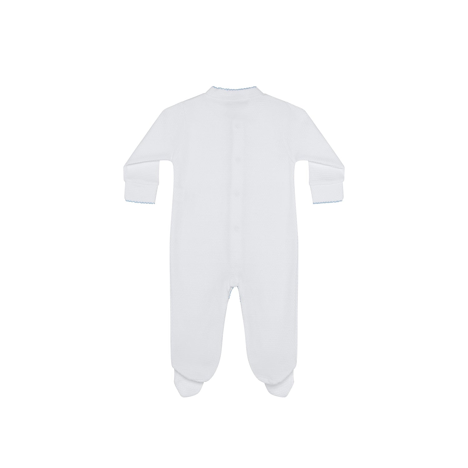 How chic! This Baby Footie Bodysuit, crafted from elegant White Bubble fabric, is the perfect addition to your little one's wardrobe. Adorned with Picot Trim details in three gorgeous colors: Pink, White, or Blue.